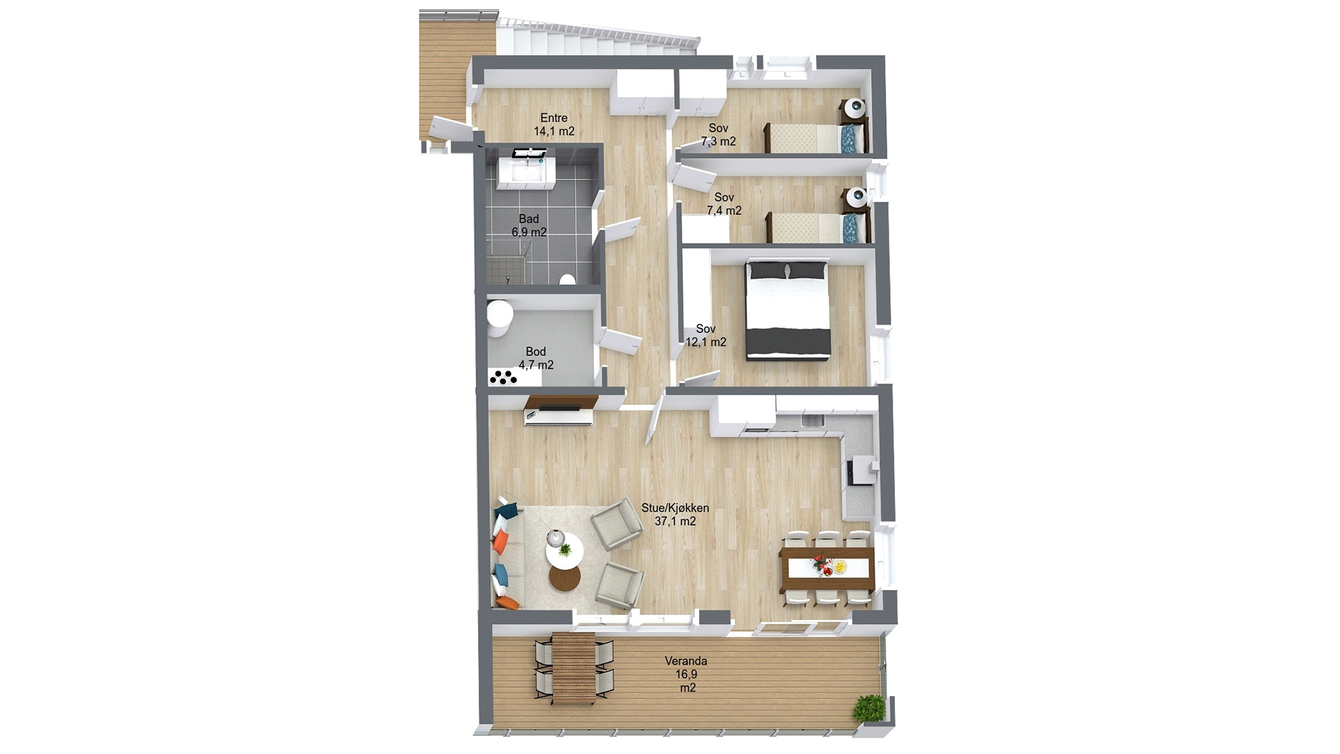 Boligen inneholder stue/kjøkken, tre soverom, bad, entré, bod, stor veranda, sportsbod og parkeringsplass i carport. I området er det tilgang til gjesteparkering og flotte lekeplasser, med bl.a. lekeapparat og benk.